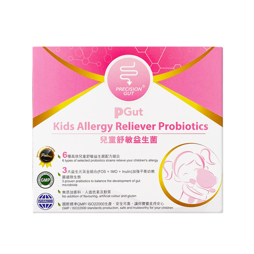 P-GUT 準腸康優點 PGut兒童舒敏益生菌 每包含150億活性益生菌,包括6種活性益生菌及3種益生元。專為濕敏兒童而設的益生菌,平衡幼嫩腸道微生態,並且減少濕敏的風險。 使用方法 請參閱包裝上說明。 儲存方法 - 請保存在陰涼處,避免陽光直射