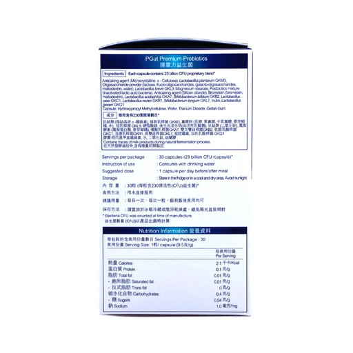 P-GUT 準腸康優點 - 每粒含230億活性益生菌 - 獨有E3活腸配方—結合益生菌、益生元及後生元,煥活身心健康 提升免疫力,改善睡眠質素、精神緊張 有助舒緩情緒壓力、常保輕鬆心情 使用方法 每日一次,每次一粒,飯前飯後食用均可 儲存方法 - 請保存在陰涼處,避免陽光直射